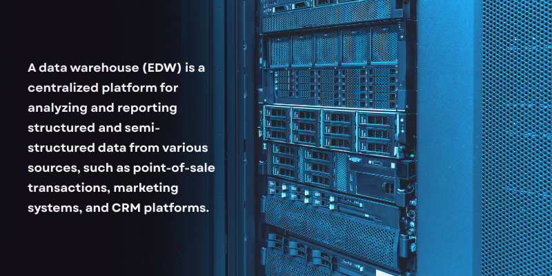 A data warehouse (EDW) is a centralized platform for analyzing and reporting structured and semi-structured data from various sources, such as point-of-sale transactions, marketing systems, and CRM platforms.