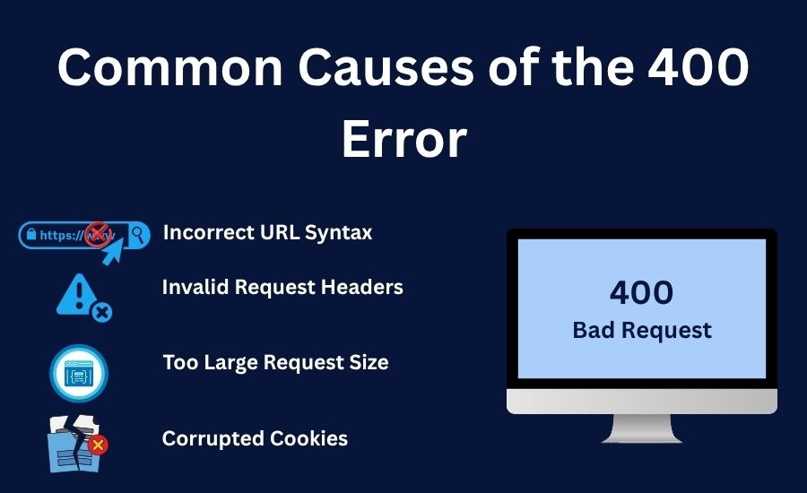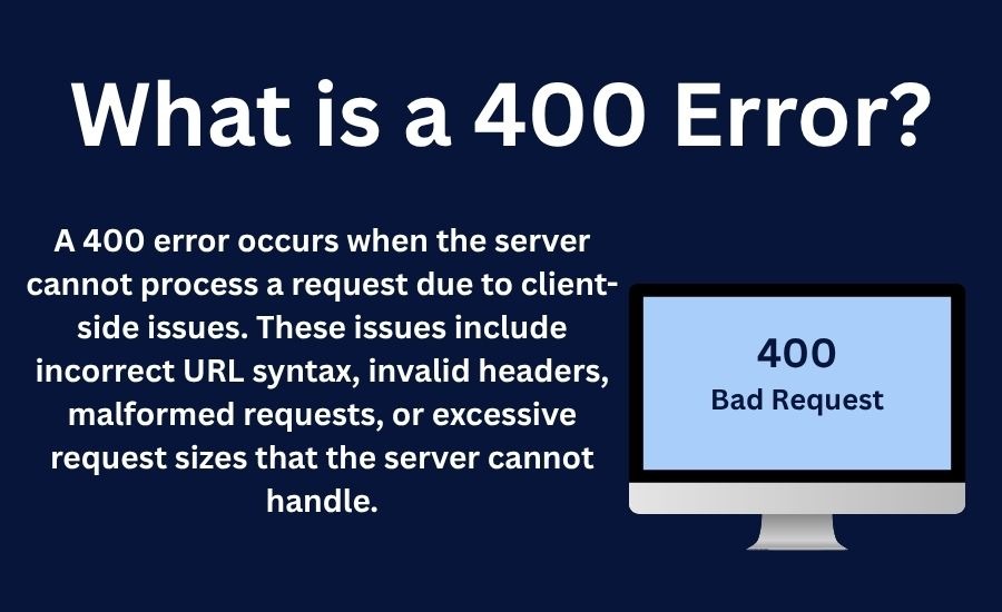 A 400 error occurs when the server cannot process a request due to client-side issues. Common causes include incorrect URL syntax, invalid request headers, large request size, or corrupted cookies. These problems prevent the server from understanding or processing the request.
