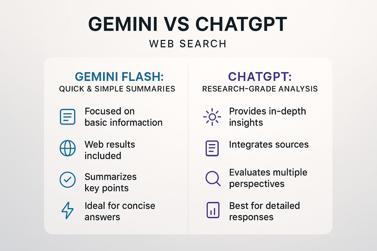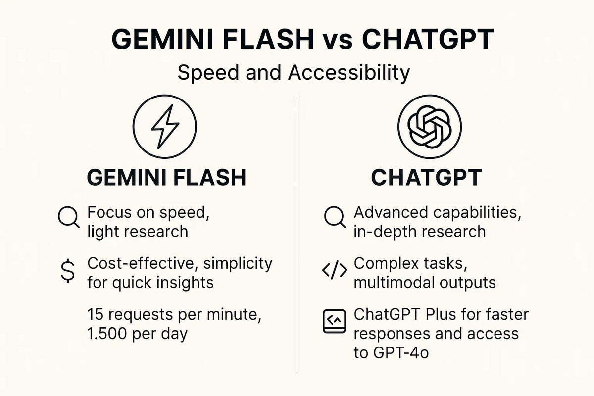 Gemini Flash is faster and simpler, ideal for light research and quick insights. ChatGPT offers more in-depth and technical capabilities for comprehensive research tasks.