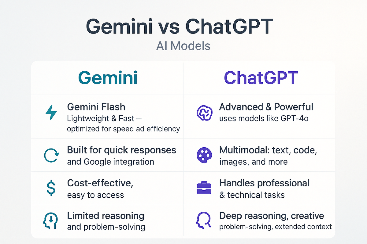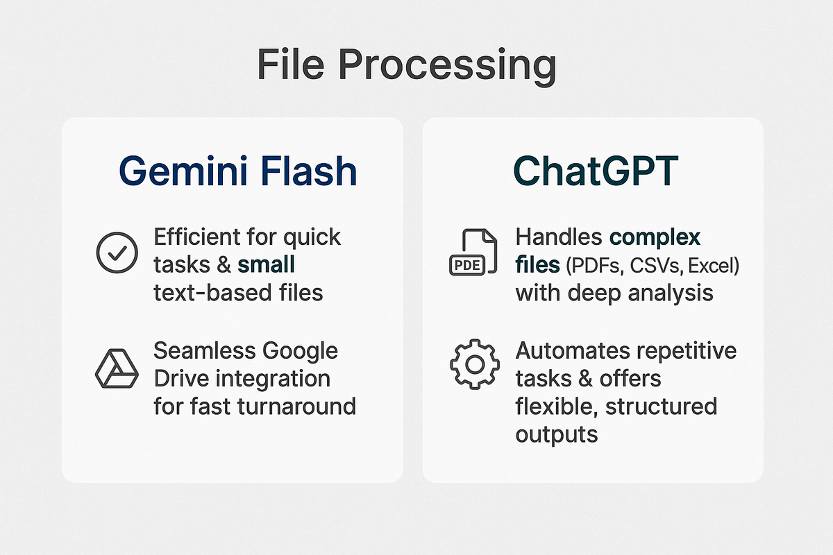 Gemini Flash is designed for quick turnaround and integration with Google Drive, while ChatGPT offers deeper reasoning, formatting options, and more flexible outputs.