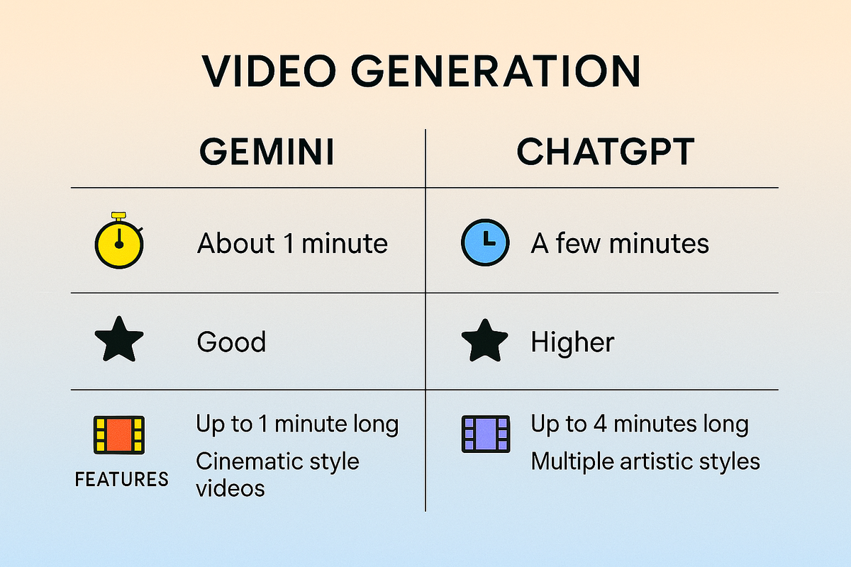 Gemini Flash highlights speed and automated video creation tools, whereas ChatGPT emphasizes creative assistance, scripting, and guided storytelling, often complementing third-party editors.