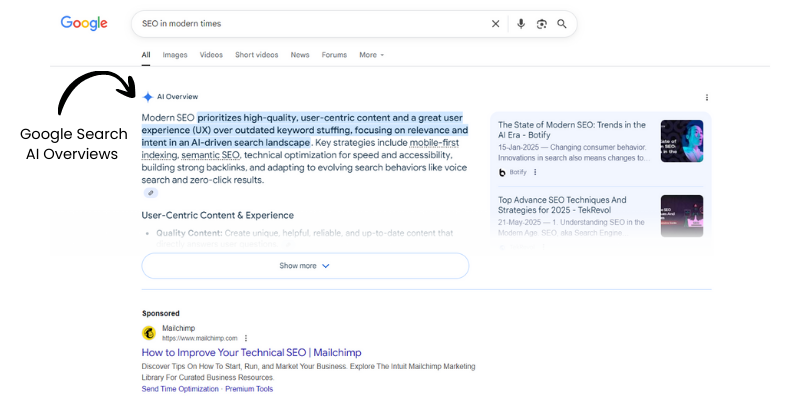 - Google Search: AI Overviews (formerly Search Generative Experience) provides summarized answers at the top of results.