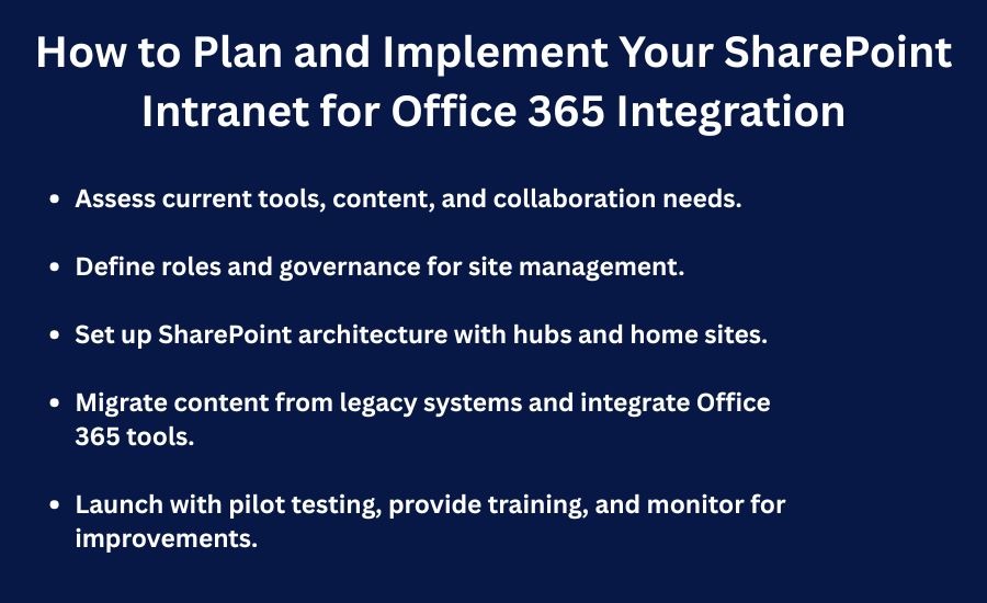 Follow these steps to plan and implement your SharePoint intranet. Doing so will help you integrate SharePoint seamlessly into your Office 365 environment and maximize its potential.