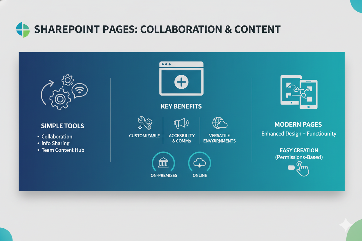 SharePoint pages are simple tools used for collaboration and sharing information, and they are often the first place users begin when learning what is Microsoft SharePoint. They help teams create and display content while keeping all important information in one place.