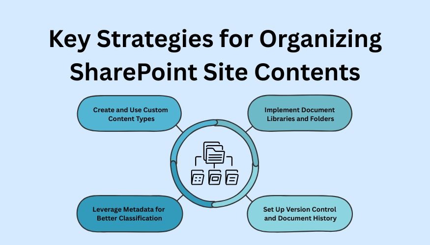 Efficient management of SharePoint site contents is essential for improving organization-wide collaboration and productivity. Key strategies include using custom content types, implementing metadata for classification, setting up document libraries with clear folder structures, and automating workflows. Regular content audits and user training also play a critical role in maintaining an organized environment. By following SharePoint best practices, organizations can streamline document management, reduce search time, and enhance team collaboration. These strategies ensure that content is accessible, secure, and up-to-date.