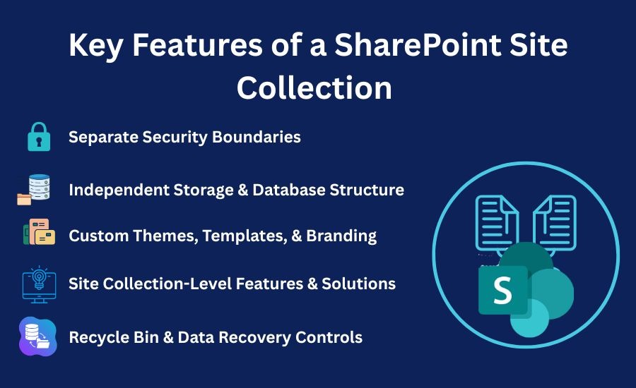 Site collections come with strong data recovery options. When users delete a file, it does not disappear immediately. It first goes to the site recycle bin, and then to the site collection recycle bin if needed. This gives users and admins time to restore important files. It reduces the risk of losing valuable information and keeps work safe.
