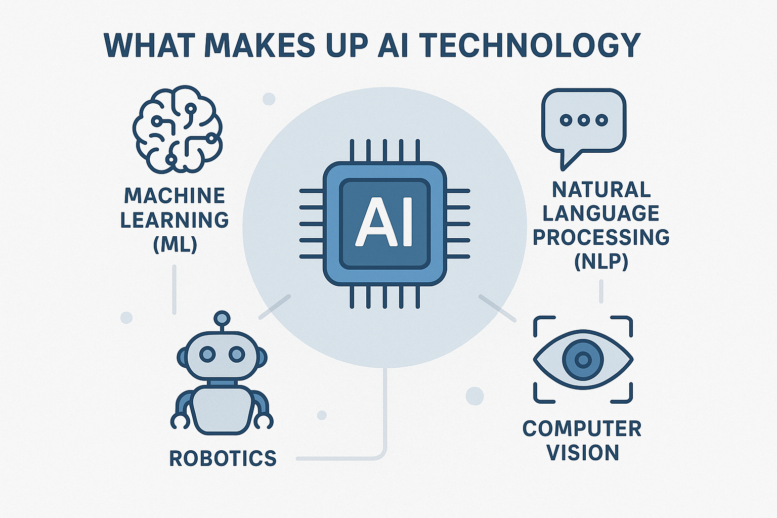 AI is not a single technology, but a collection of interrelated fields that work together. Key components include:
