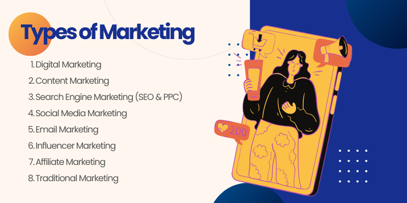 Businesses use different marketing methods to reach audiences, share their message, and build relationships. Each type plays a unique role in promoting products or services, depending on where customers spend their time and how they prefer to receive information.