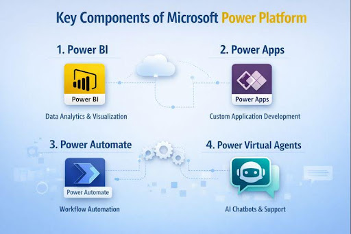The Microsoft Power Platform is built around a set of tightly connected tools that work together as a low-code platform. Each component serves a specific purpose, but when combined, they create powerful end-to-end business solutions.