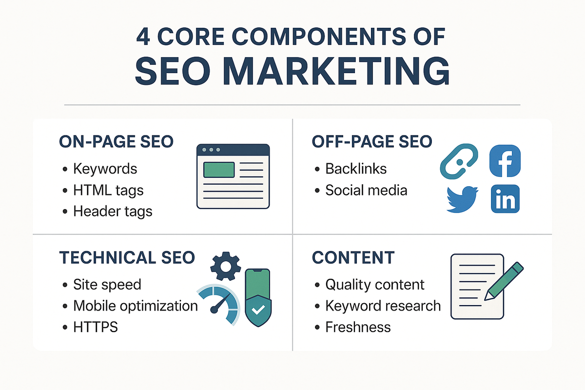 The core components of SEO marketing include on-page SEO (optimizing web pages with relevant content and keywords), off-page SEO (building site authority through backlinks and social media engagement), and technical SEO (improving site performance, mobile-friendliness, and security for better crawling and indexing).