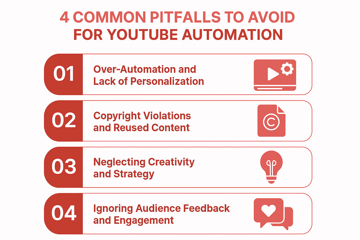 1. Over-Automation and Lack of Personalization: One of the biggest pitfalls of YouTube automation is relying too heavily on AI and tools without adding a personal touch. While automation can handle many tasks, it cannot replace the creativity, personality, and unique voice that make your content stand out. Over-automated content can feel generic, which may lead to low engagement and reduced viewership. Always find a balance between automation and human input to maintain originality.