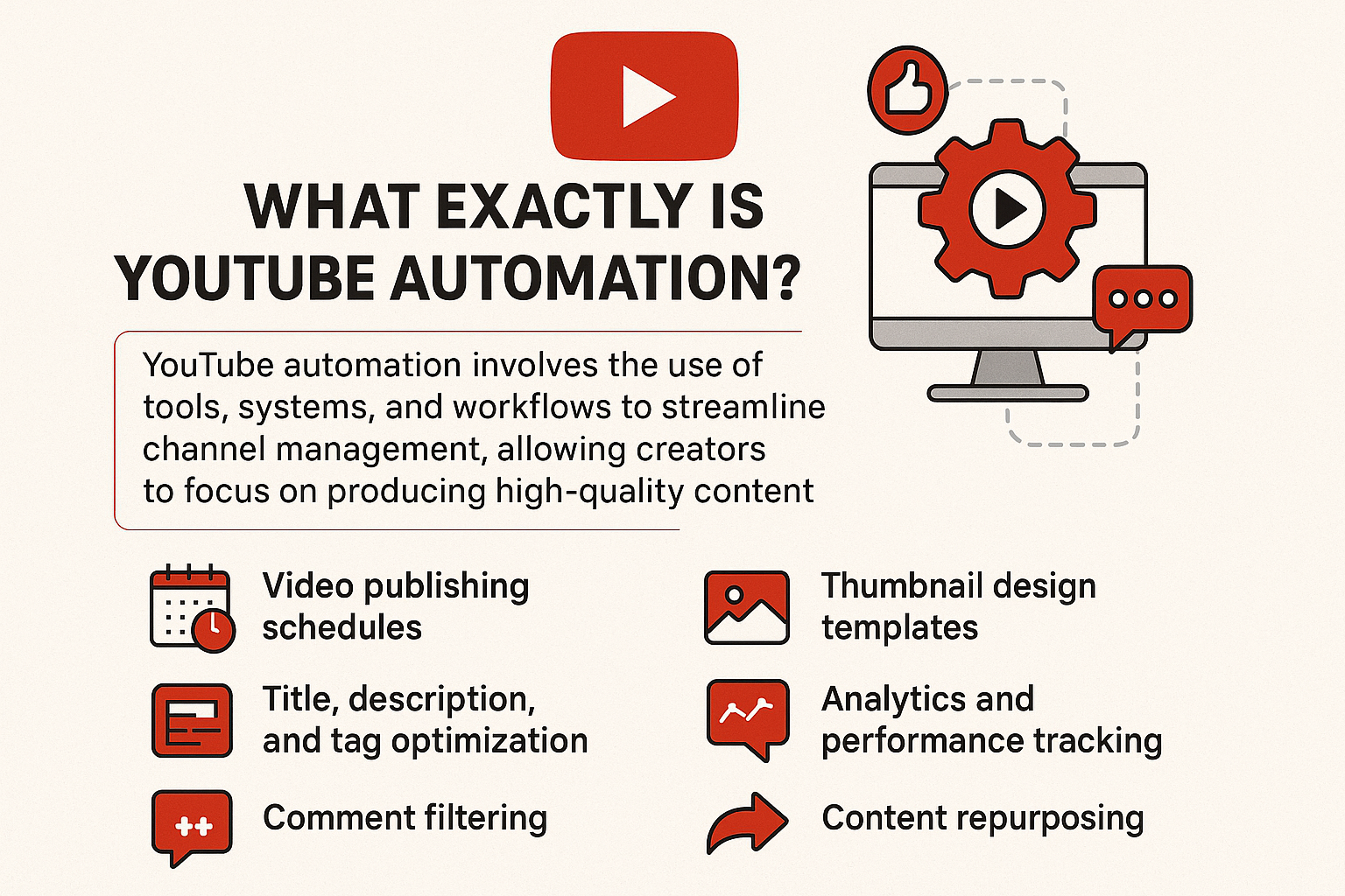 YouTube automation refers to the strategic use of tools, systems, and workflows to simplify or eliminate the manual efforts associated with YouTube channel management.