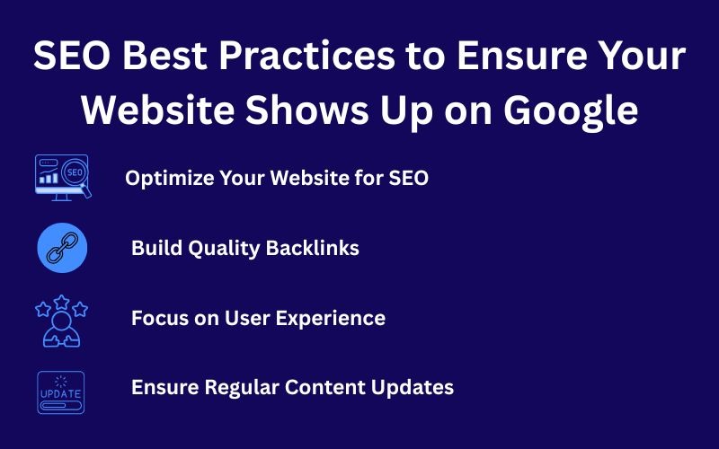 If you’re asking why is my website not showing up on Google, SEO best practices are essential for improving visibility. Following these practices will help Google rank your site higher and show it to more people. Here are key SEO strategies you can apply to ensure your website is seen on Google.